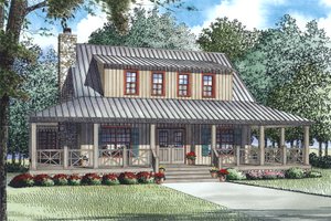 This rustic farmhouse plan has a covered wraparound porch with timber and stone columns. In addition to the spacious great room kitchen and dining area the main floor hosts a large master suite with his and hers closets a second bedroom a hall bath and a spacious laundrypantry. Warm and welcoming wrap around porch house plans deliver major curb appeal outdoor living opportunities and views.