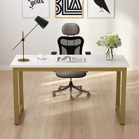Tribesigns Modern Computer Desk 55 Inches Large Office Desk Computer Table Study Writing Desk For Home Office White Gold Metal Frame