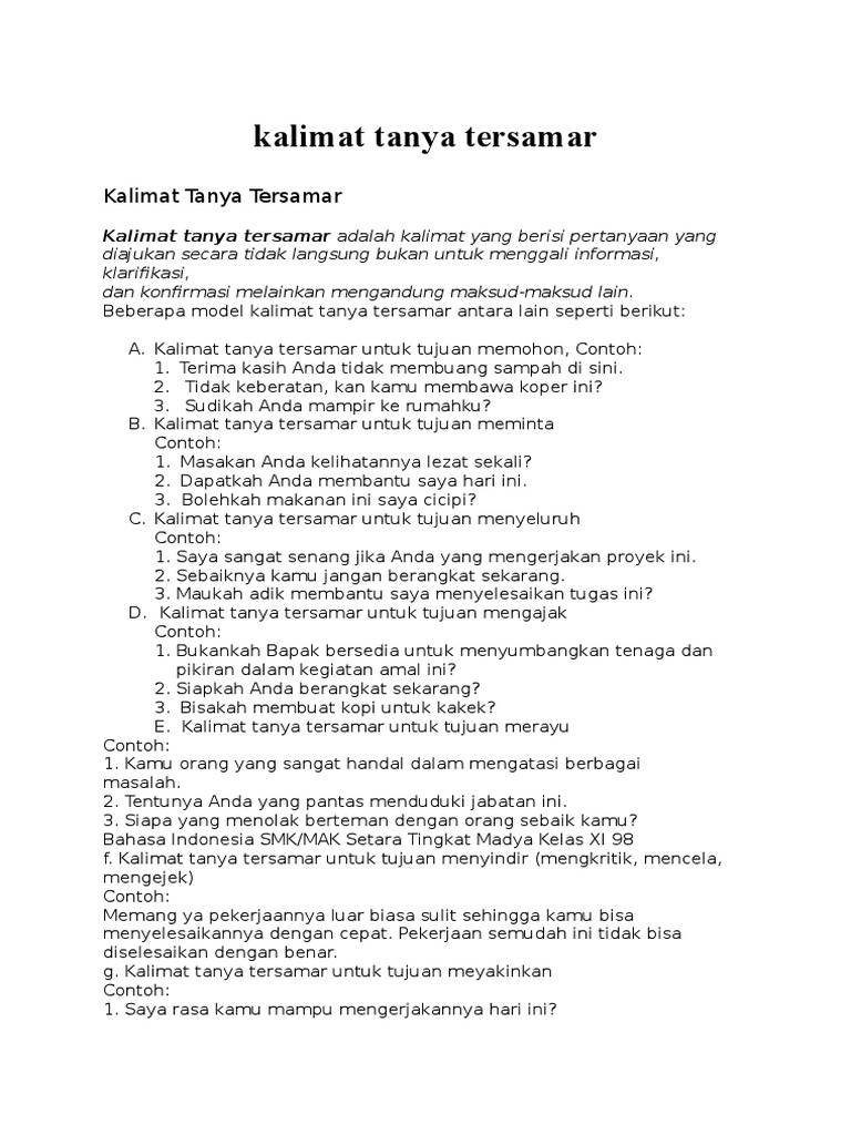 Apakah kamu sudah menemui hadi? Contoh kalimat tanya biasa, retoris, konfirmasi dan tersamar mengakhiri pembahasan kita pada kesempatan kali ini. Seperti apa contoh kalimat permohonan maaf , permintaan tolong , dan ucapan terima kasih ? Pembuatan kalimat efektif sendiri bertujuan untuk umumnya sebuah kalimat terdiri dari klausa seperti subjek, predikat, objek, pelengkap dan keterangan. Mahasiswa harus menyusun laporan, kelengkapan materi yang dilampirkan, dan.